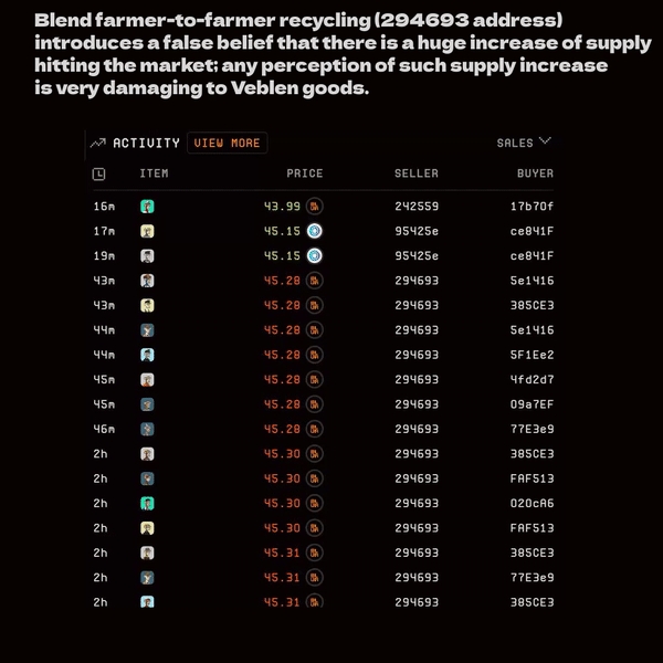 Genuine market participants interested in obtaining specific NFTs are unlikely to have the opportunity to buy them from Blur farmers, who continuously dump NFTs into other farmers using Blend. As a result, genuine buyers are sidelined, unable to engage in the market as they would prefer.